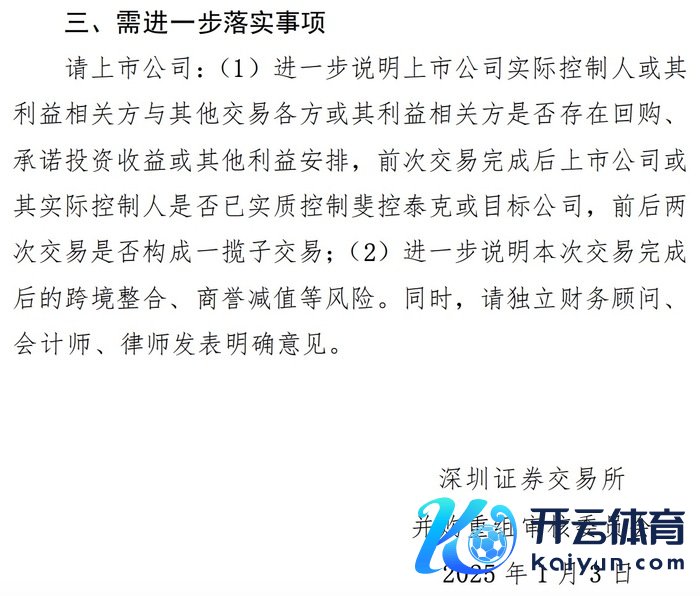 针对这次交游,深交所并购重组委现场问询:讲明上市公司实控东说念主或其利益关连方与交游对方或其利益关连方是否存在回购、甘愿投资收益或其他利益安排;讲明本次交游前上市公司或其实控东说念主是否已骨子放浪斐控泰克或方针公司,前后两次交游是否组成一揽子交游。