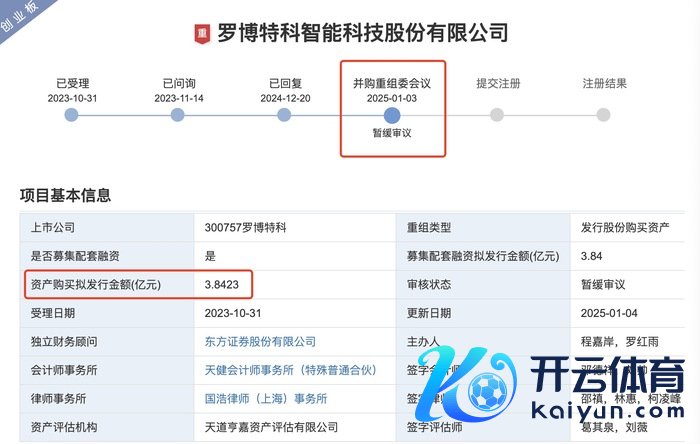 1月5日晚间,罗博特科(300757.SZ)败露,该公司于1月3日收到深交所并购重组审核委出具的公告,深交所并购重组审核委对公司刊行股份及支付现款购买钞票并召募配套资金事项进行了审议,收尾为:暂缓审议。