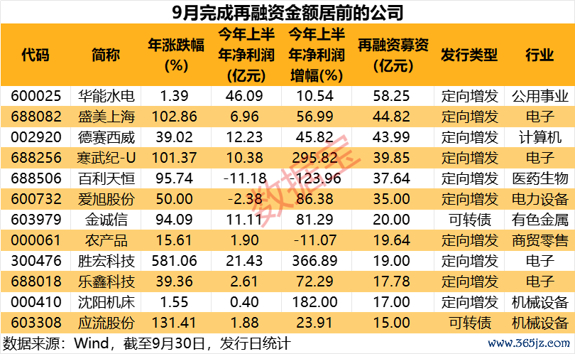 从单家公司来看,9月份完成再融资募资公司中九游体育app(中国)官方网站,有12家公司完成募资普及15亿元,其中6家普及35亿元,挨次有华能水电、盛好意思上海、德赛西威、寒武纪-U等。